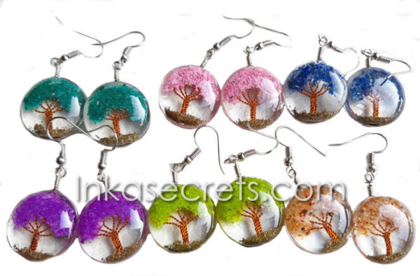 Peruvian Tree of Life earrings in alpaca silver, assorted colors and designs, approx. 2.5″. Packs from 50 to 250 pairs.