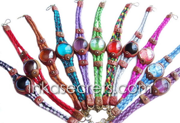 Lot of Peruvian braided dyed leather bracelets with round gem beads. Packs from 10 to 50 pieces.